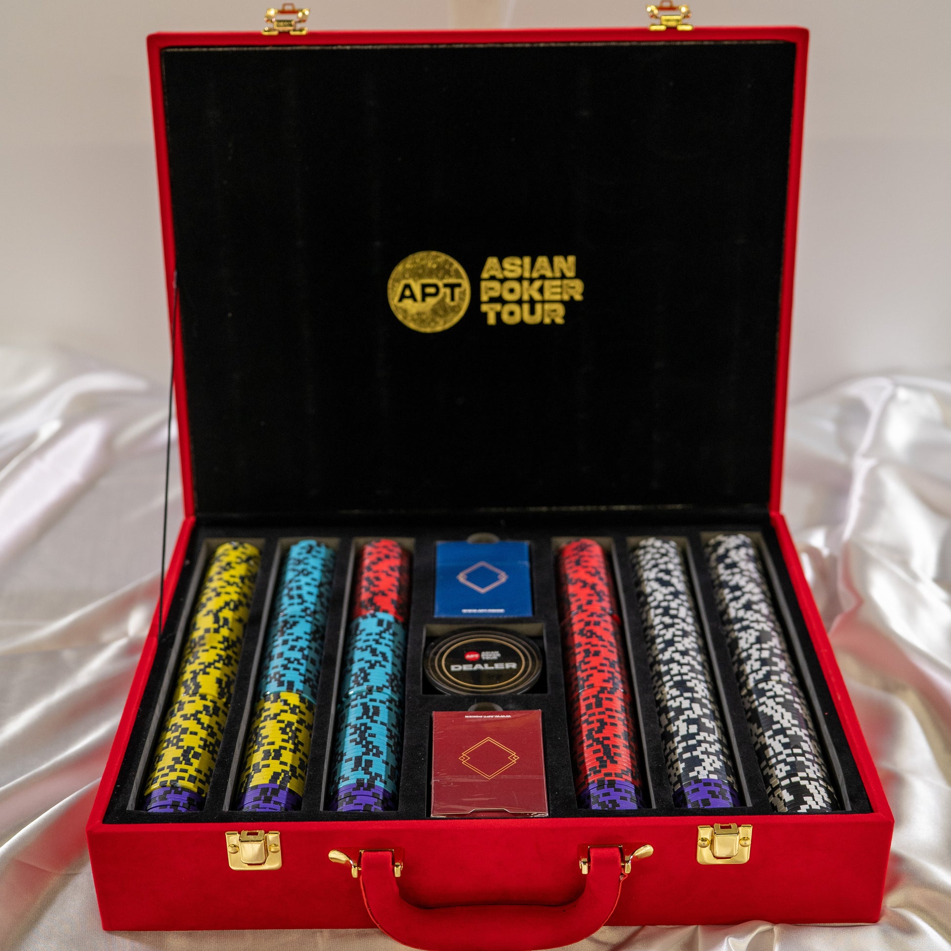 Experience the prestige and excitement of the Asian Poker Tour from the comfort of your own home. Designed for players who appreciate both craftsmanship and authenticity, the APT Poker Chip Set combines elegant design with tournament-grade quality.